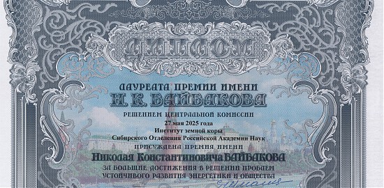 Институту земной коры вручен диплом лауреата премии имени Н.К. Байбакова